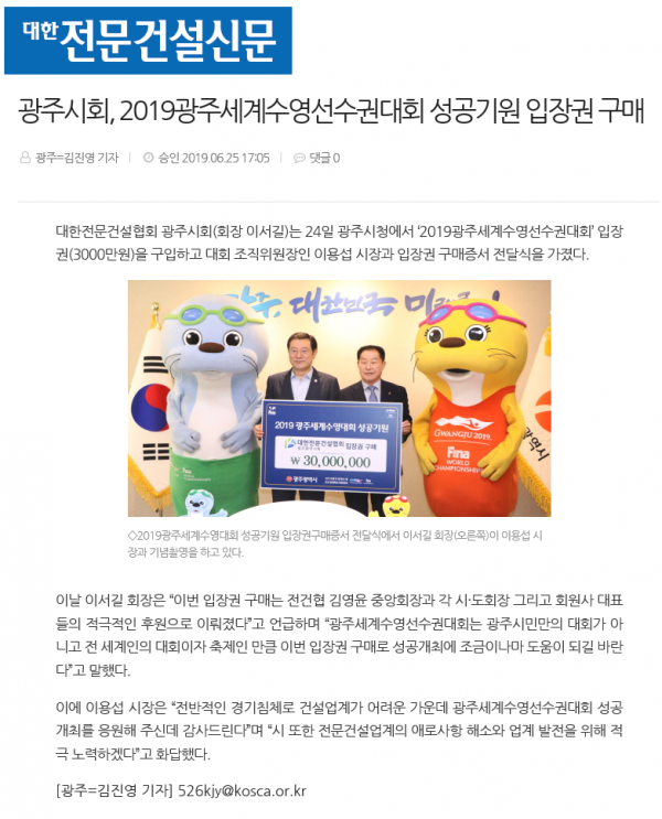 광주시회,2019광주세계수영선수권대회성공기원 입장권구매(대한전문건설신문)