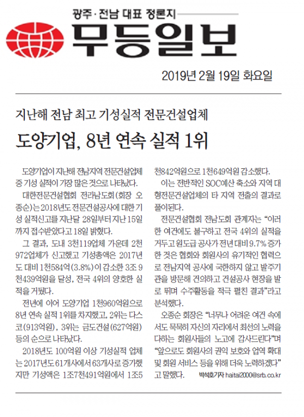 도양기업, 8년 연속 실적1위(무등일보)