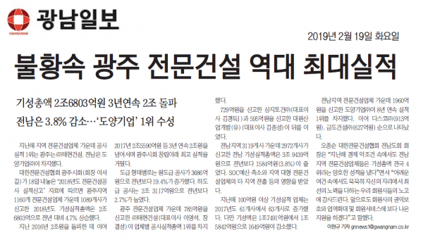 광주 전문건설공사 수주액 창립이래 최고(광주매일신문)