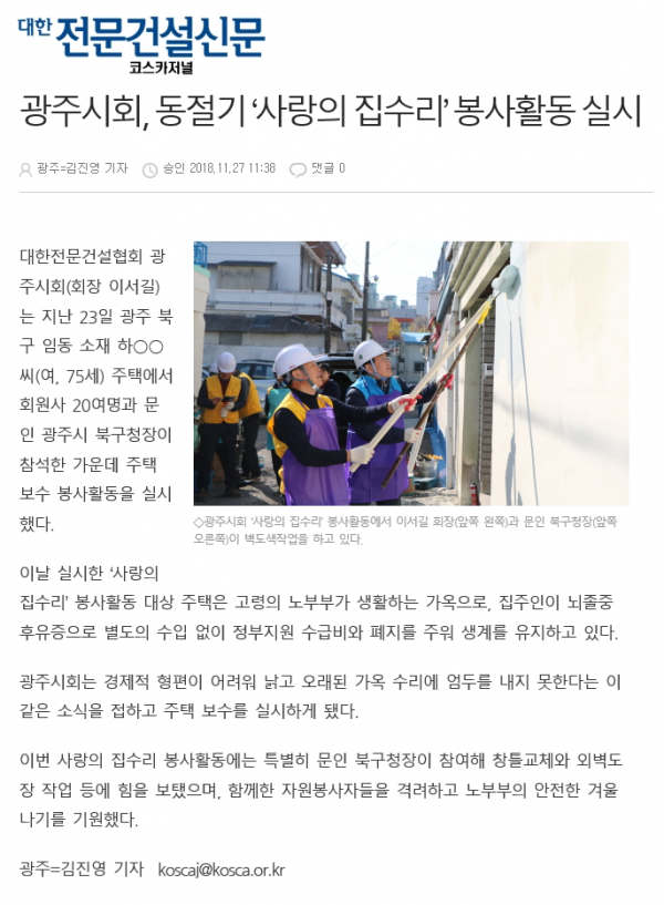 HOME > KOSCA광주 소개 > 광주시회, 동절기 ‘사랑의 집수리’ 봉사활동 실시 (대한전문건설신문) > 보도자료