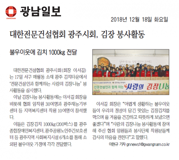 대한전문건설협회 광주시회, 김장 봉사활동(광남일보)