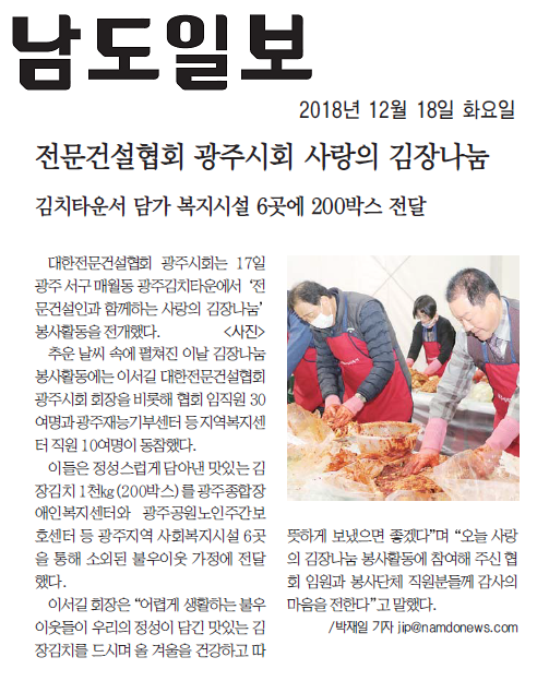 HOME > KOSCA광주 소개 > 전문건설협회 광주시회 사랑의 김장나눔 (남도일보) > 보도자료