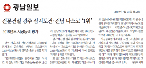 HOME > KOSCA광주 소개 > 전문건설 광주 삼지토건, 전남 다스코 1위 (광남일보) > 보도자료