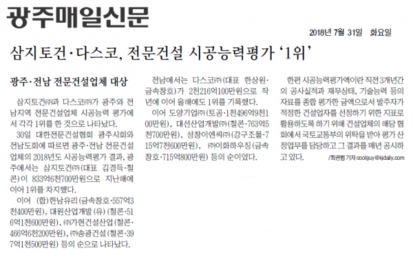 삼지토건.다스코, 전문건설 시공능력평가 '1위' (광주매일신문)