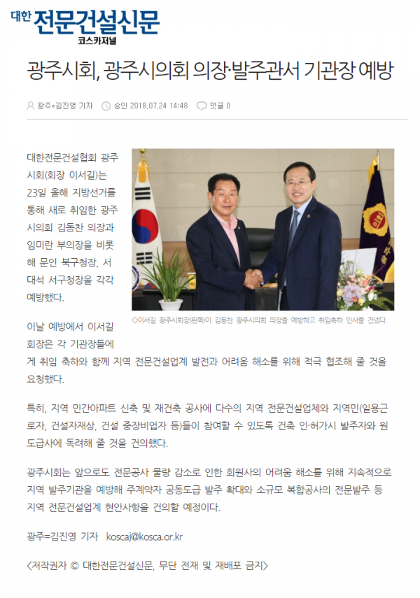 HOME > KOSCA광주 소개 > 광주시회, 광주시의회 의장·발주관서 기관장 예방 (전문건설신문) > 보도자료