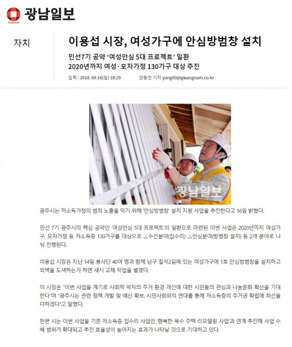 이용섭 시장, 여성가구에 안심방범창 설치 (광남일보)