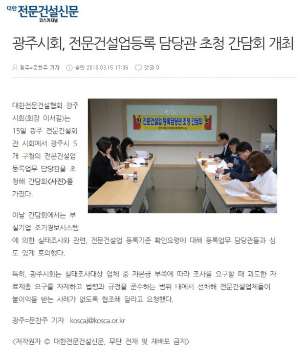 광주시회, 전문건설업등록 담당관 초청 간담회 개최 (대한전문건설신문)