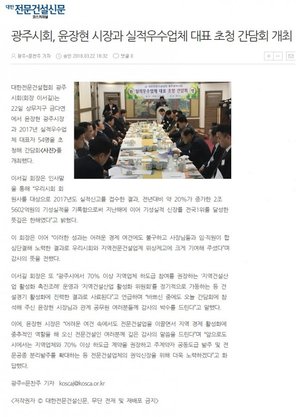 윤장현 시장과 실적우수업체대표 초청 간담회 개최 (대한전문건설신문)