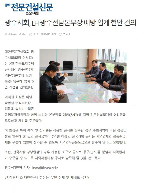 HOME > KOSCA광주 소개 > 광주시회, LH광주전남본부 예방 업계 현안 건의(대한전문건설신문) > 보도자료