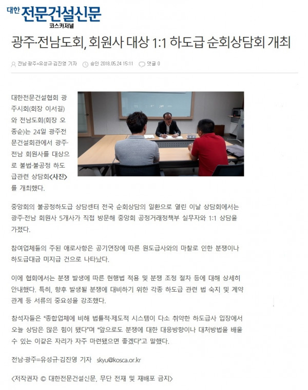 HOME > KOSCA광주 소개 > 광주.전남도회, 회원사대상1:1하도급순회상담회 개최(대한전문건설신문) > 보도자료