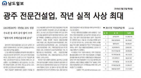 광주 전문건설업, 작년 실적 사상 최대 (남도일보)