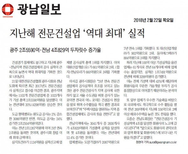 전문건설업계 지난해 역대 최고 실적 (광주일보)