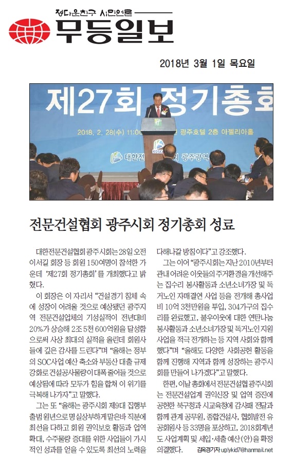 광주시회, 제27회 정기총회 (대한전문건설신문)