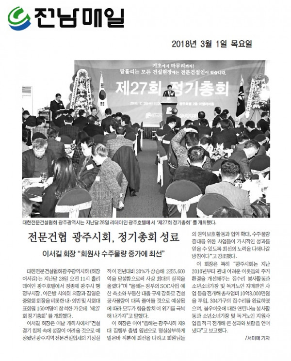 광주시회, 제27회 정기총회 (대한전문건설신문)