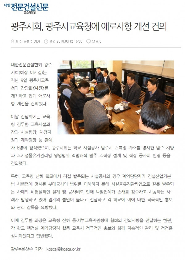 HOME > KOSCA광주 소개 > 광주시회, 광주시교육청에 애로사항 개선 건의 (대한전문건설신문) > 보도자료
