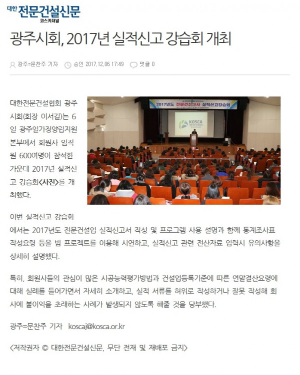 광주시회, 2017년 실적신고 강습회 개최 (대한전문건설신문)