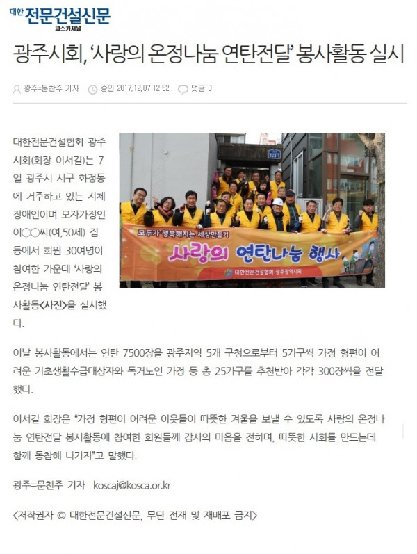 HOME > KOSCA광주 소개 > 광주시회, ‘사랑의 온정나눔 연탄전달’ 봉사활동 실시 (대한전문건설신문) > 보도자료