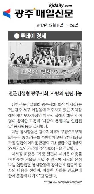 전문건설협 광주시회, 사랑의 연탄나눔 (광주매일신문)
