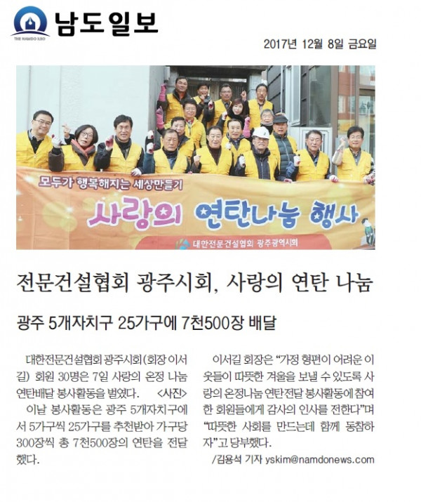 전문건설협회 광주시회, 사랑의 연탄 나눔 (남도일보)