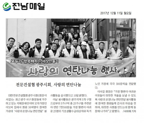 HOME > KOSCA광주 소개 > 전문건설협 광주시회, 사랑의 연탄나눔 (전남매일신문) > 보도자료