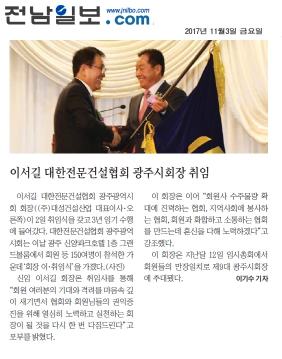 이서길 대표, 대한전문건설협회 광주시회장으로 ‘추대’ (남도일보)