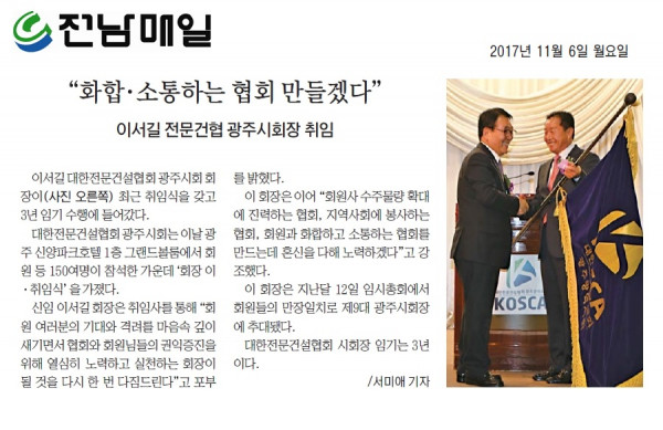 이서길 대한전문건설협회 광주시회장 취임 (남도일보)