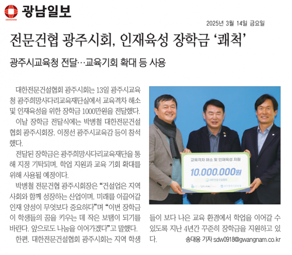 대한전문건설협 광주시회, 장학금 1천만원 전달 (남도일보)