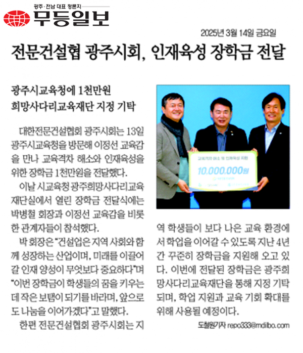 전문건설협 광주시회, 인재육성 장학금 전달 (무등일보)