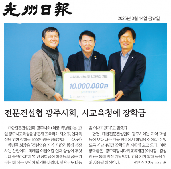 대한전문건설협 광주시회, 장학금 1천만원 전달 (남도일보)