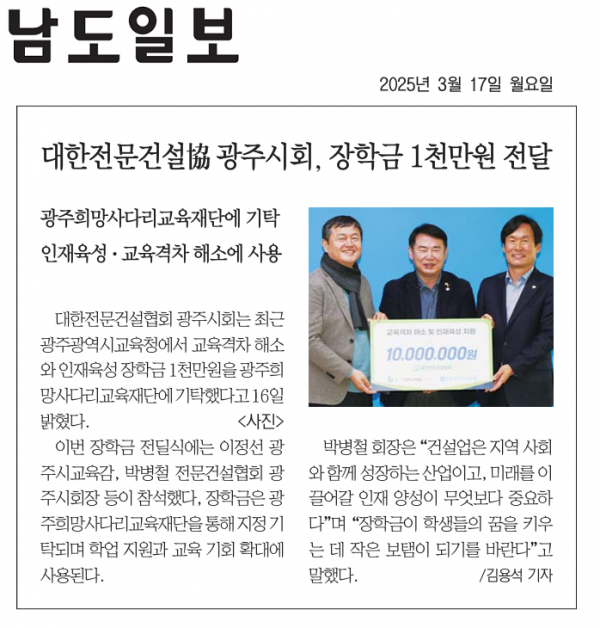 대한전문건설협 광주시회, 장학금 1천만원 전달 (남도일보)