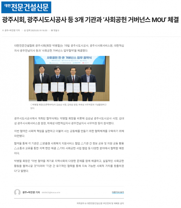광주시회, 광주시도시공사 등 3개 기관과 ‘사회공헌 거버넌스 MOU’ 체결 (대한전문건설신문) 페이지 정보 작성자 전문건설협회광주광역시회 댓글 0건 조회 1,267회 작성일 2025-03-20 09:26 목록 본문