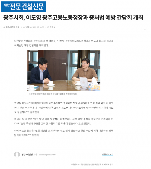 광주시회, 이도영 광주고용노동청장과 중처법 예방 간담회 개최 (대한전문건설신문) 페이지 정보 작성자 전문건설협회광주광역시회 댓글 0건 조회 1,305회 작성일 2025-03-25 16:14 목록 본문