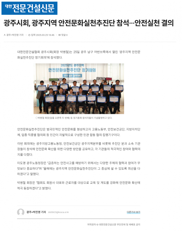 광주시회, 광주지역 안전문화실천추진단 참석···안전실천 결의 (대한전문건설신문) 페이지 정보 작성자 전문건설협회광주광역시회 댓글 0건 조회 1,291회 작성일 2025-03-27 10:51 목록 본문