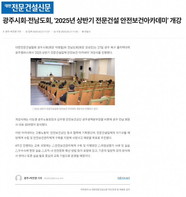 광주시회·전남도회, ‘2025년 상반기 전문건설 안전보건아카데미’ 개강 (대한전문건설신문) 페이지 정보 작성자 전문건설협회광주광역시회 댓글 0건 조회 1,356회 작성일 2025-03-31 09:09 목록 본문