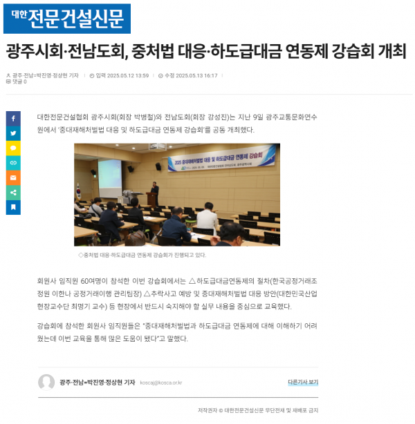 광주시회·전남도회, 중처법 대응·하도급대금 연동제 강습회 개최 (대한전문건설신문) 페이지 정보 작성자 전문건설협회광주광역시회 댓글 0건 조회 1,170회 작성일 2025-05-13 16:45 목록 본문