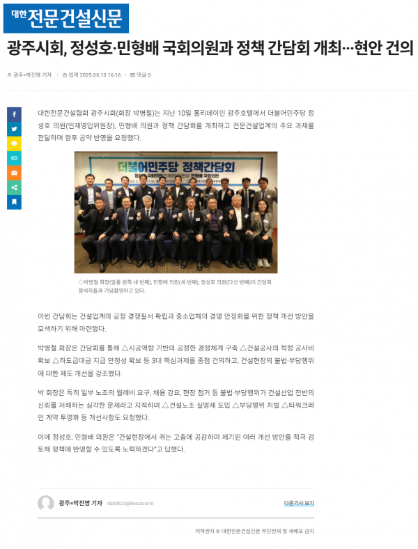 광주시회, 정성호·민형배 국회의원과 정책 간담회 개최···현안 건의 (대한전문건설신문) 페이지 정보 작성자 전문건설협회광주광역시회 댓글 0건 조회 1,285회 작성일 2025-05-13 16:45 목록 본문
