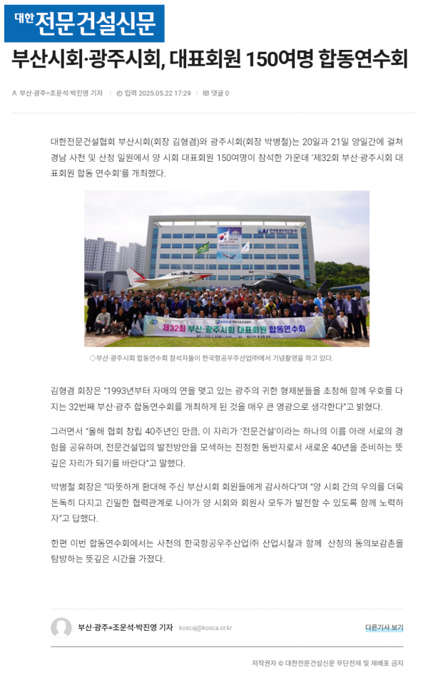 부산시회·광주시회, 대표회원 150여명 합동연수회 (대한전문건설신문) 페이지 정보 작성자 전문건설협회광주광역시회 댓글 0건 조회 1,258회 작성일 2025-05-23 10:57 목록 본문