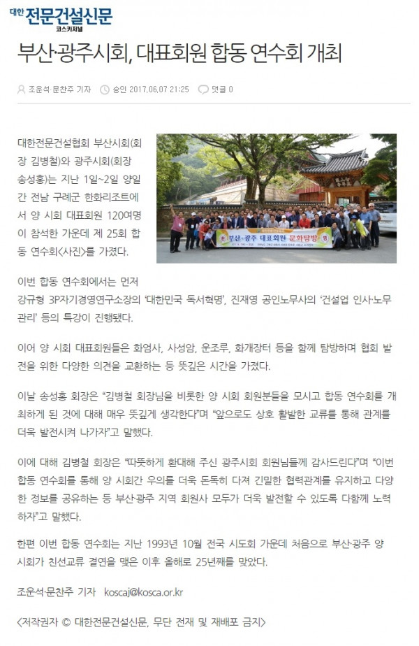 부산·광주시회, 대표회원 합동 연수회 개최 (대한전문건설신문)