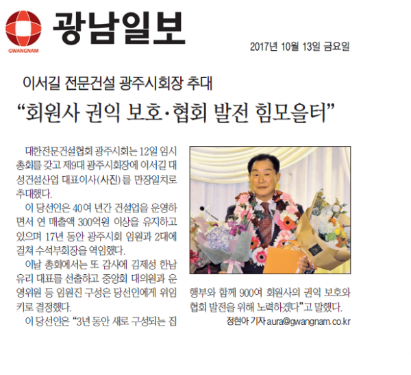 전문건협 광주시 9대회장 이서길 대성건설산업 대표 (전남매일신문)