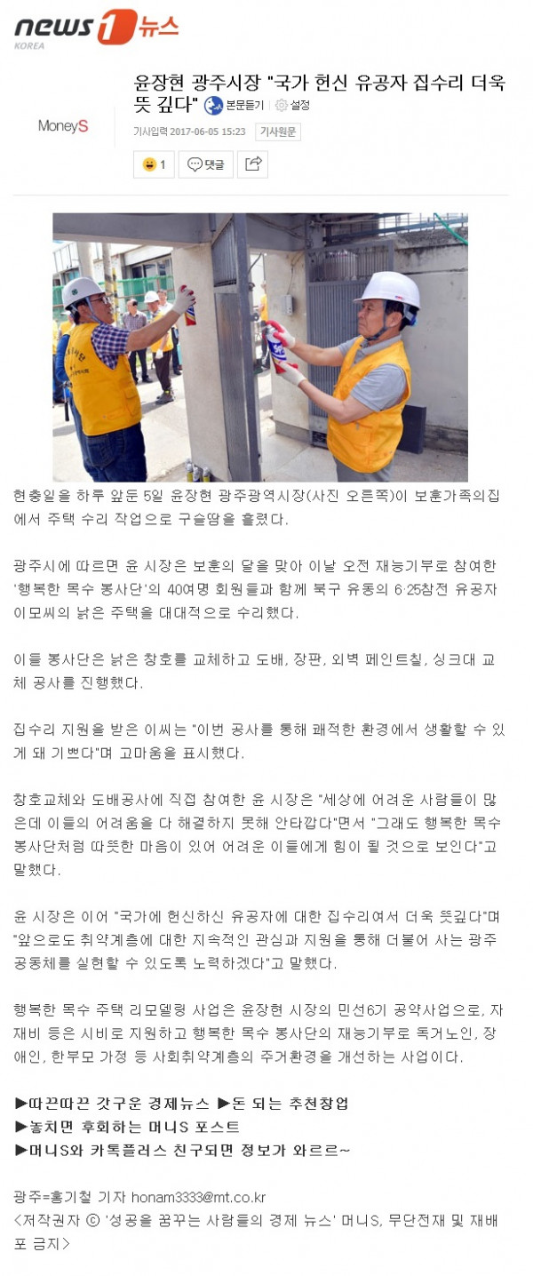 HOME > KOSCA광주 소개 > 윤장현 광주시장 "국가 헌신 유공자 집수리 더욱 뜻 깊다" (뉴스1) > 보도자료