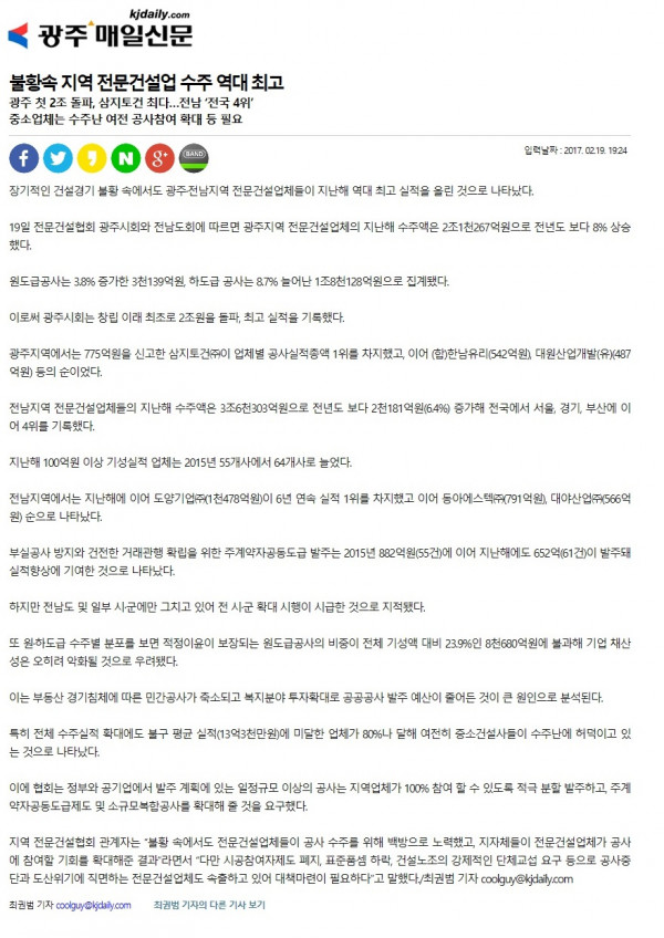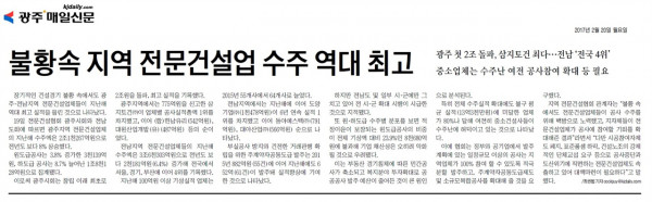 불황속 지역 전문건설업 수주 역대 최고 (광주매일신문)