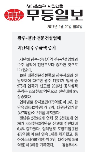 광주.전남 전문건설업체 지난해 수주금액 증가 (무등일보)
