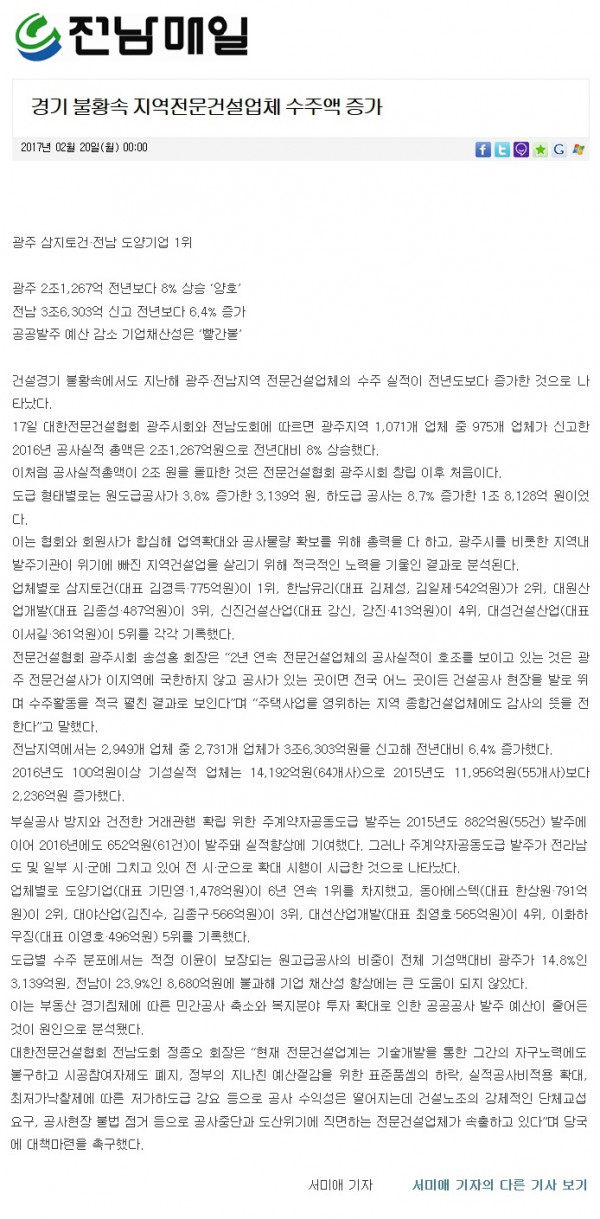 불황속 지역 전문건설업 수주 역대 최고 (광주매일신문)
