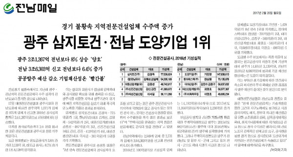 HOME > KOSCA광주 소개 > 광주 삼지토건, 전남 도양기업 1위 (전남매일) > 보도자료