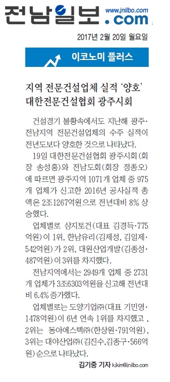 경기 불황속 광주전남 전문건설업체 수주금액 증가 (호남일보)