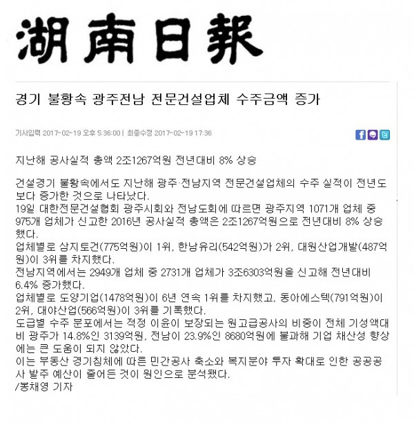 불황속 지역 전문건설업 수주 역대 최고 (광주매일신문)