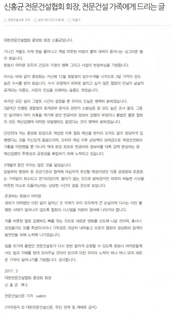 신홍균 전문건설협회 회장, 전문건설 가족에게 드리는 글(대한전문건설신문)