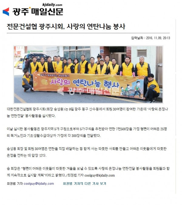 전문건설협 광주시회, 사랑의 연탄나눔 봉사 (광주매일신문)