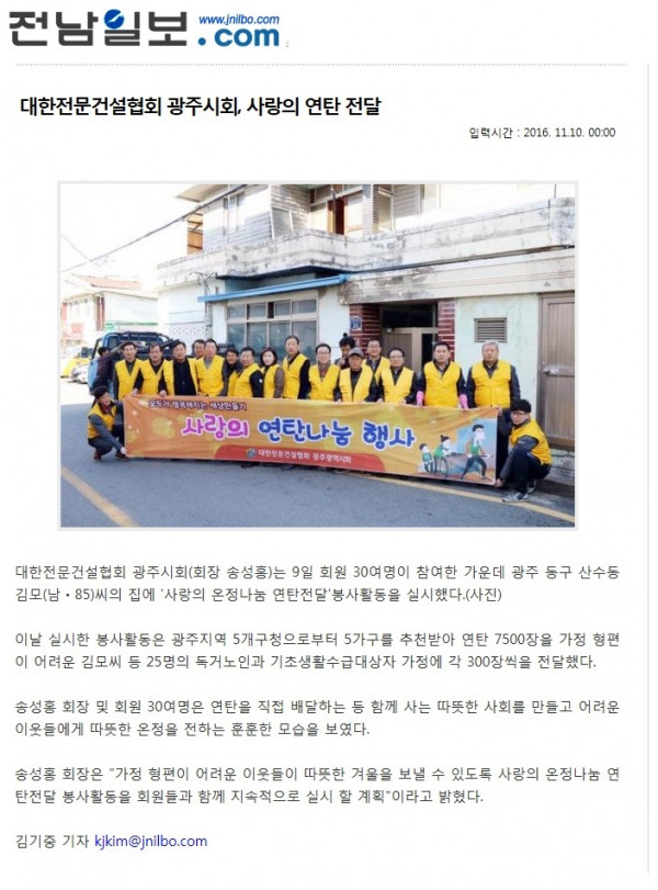대한전문건설협회 광주시회, 사랑의 연탄 전달 (전남일보)