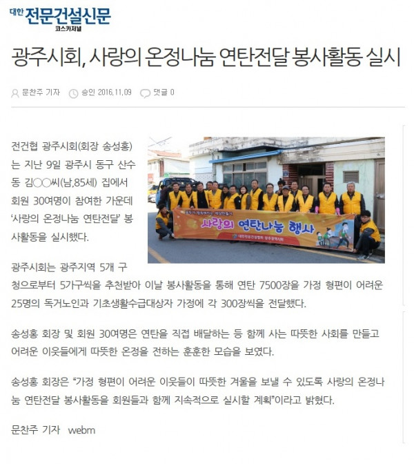 광주시회, 사랑의 온정나눔 연탄전달 봉사활동 실시 (대한전문건설신문)
